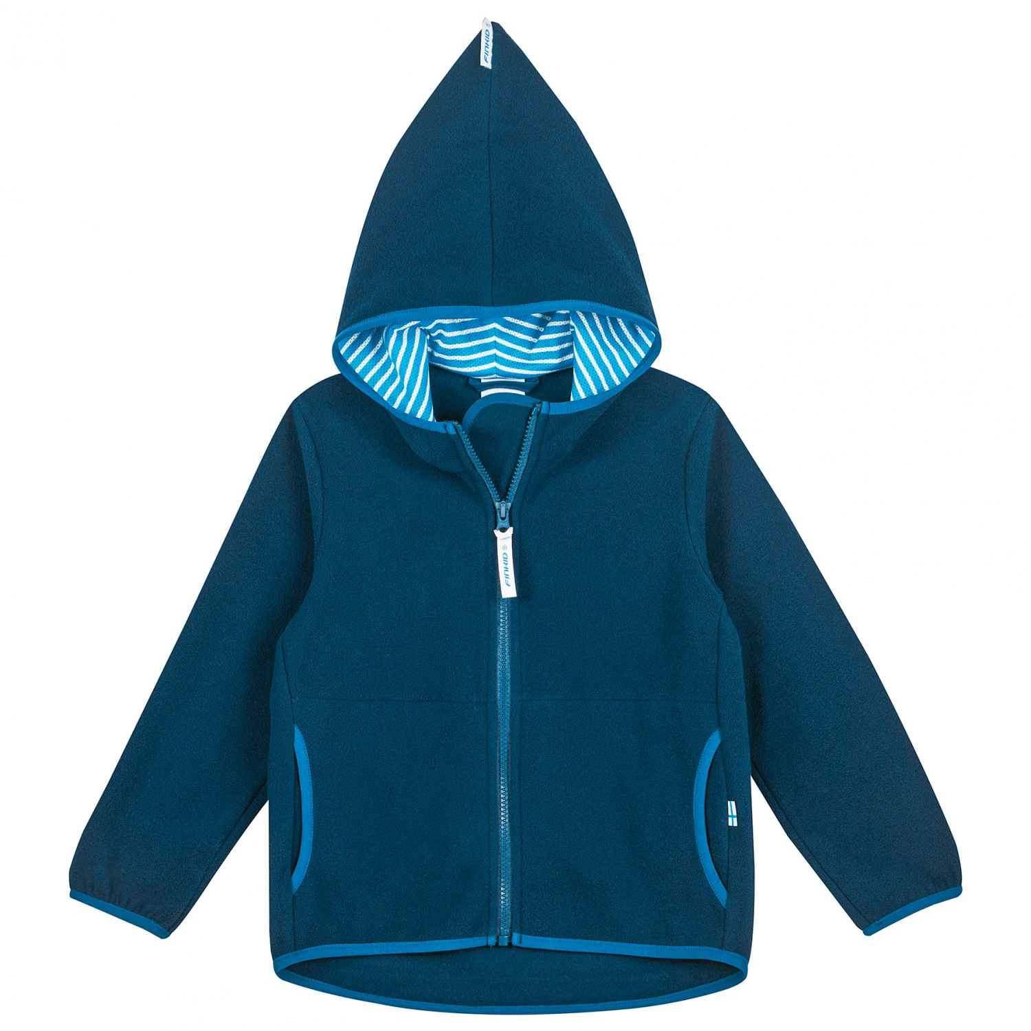 Die Kapuze kommt mit einem Innenfutter mit Streifenmuster. Bei Regenwetter kann die Kid’s Paukku in eine kompatible Außenjacke von Finkid eingezippt werden!